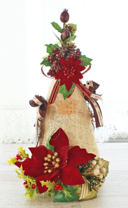 ラメのついた華やかなベリーとシックなリボンがポイントのクリスマスツリーアレンジです。