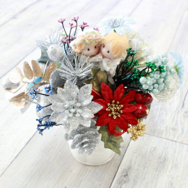 クリスマスの定番のポインセチアに中央にいる天使たちがかわいいアレンジです。